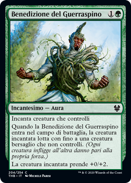 | Rules | Enchant creature you control When Warbriar Blessing enters the battlefield, enchanted creature fights up to one target creature you don't control. (Each deals damage equal to its power to the other.) Enchanted creature gets +0/+2. |
