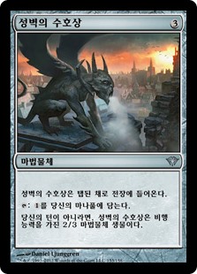 As long as it's not your turn, Warden of the Wall is a 2/3 Gargoyle artifact creature with flying.