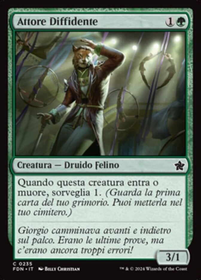 | Rules | When Wary Thespian enters the battlefield or dies, surveil 1. (Look at the top card of your library. You may put that card into your graveyard.) |