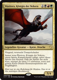 | Rules | Flying, trample Whenever Wasitora, Nekoru Queen deals combat damage to a player, that player sacrifices a creature. If the player can't, you create a 3/3 black, red, and green Cat Dragon creature token with flying. |