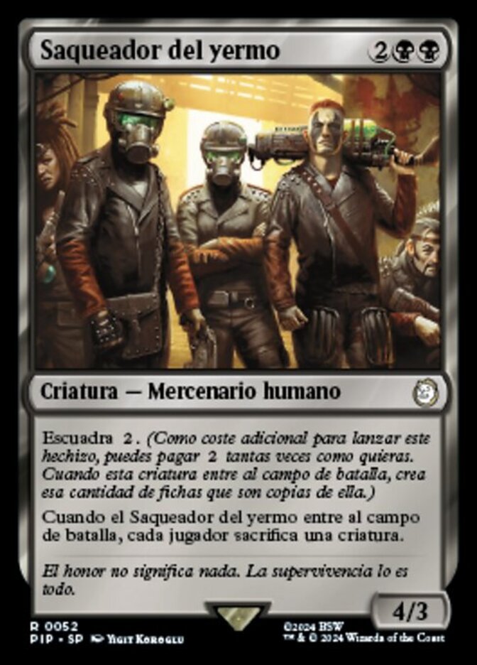 | Rules | Squad (As an additional cost to cast this spell, you may pay any number of times. When this creature enters the battlefield, create that many tokens that are copies of it.) When Wasteland Raider enters the battlefield, each player sacrifices a creature. |