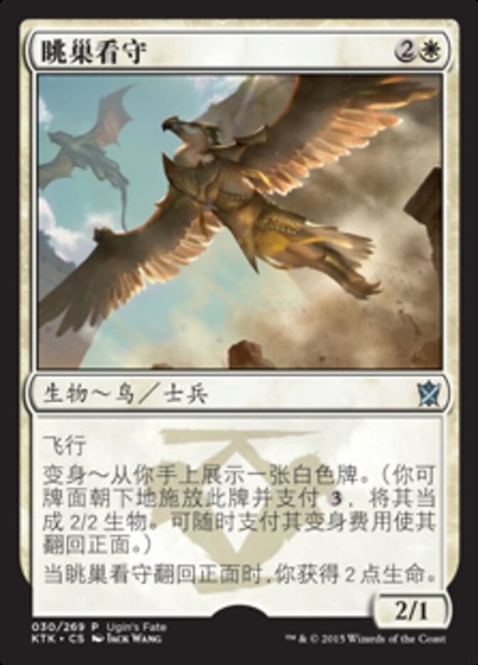 | Rules | Flying Morph—Reveal a white card in your hand. (You may cast this card face down as a 2/2 creature for . Turn it face up any time for its morph cost.) When Watcher of the Roost is turned face up, you gain 2 life. |