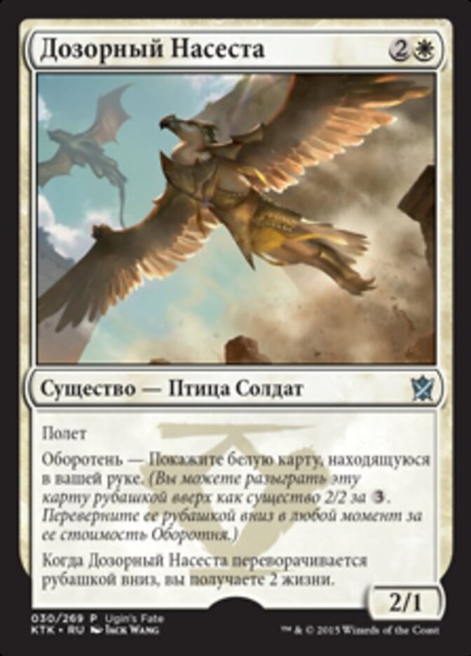 | Rules | Flying Morph—Reveal a white card in your hand. (You may cast this card face down as a 2/2 creature for . Turn it face up any time for its morph cost.) When Watcher of the Roost is turned face up, you gain 2 life. |