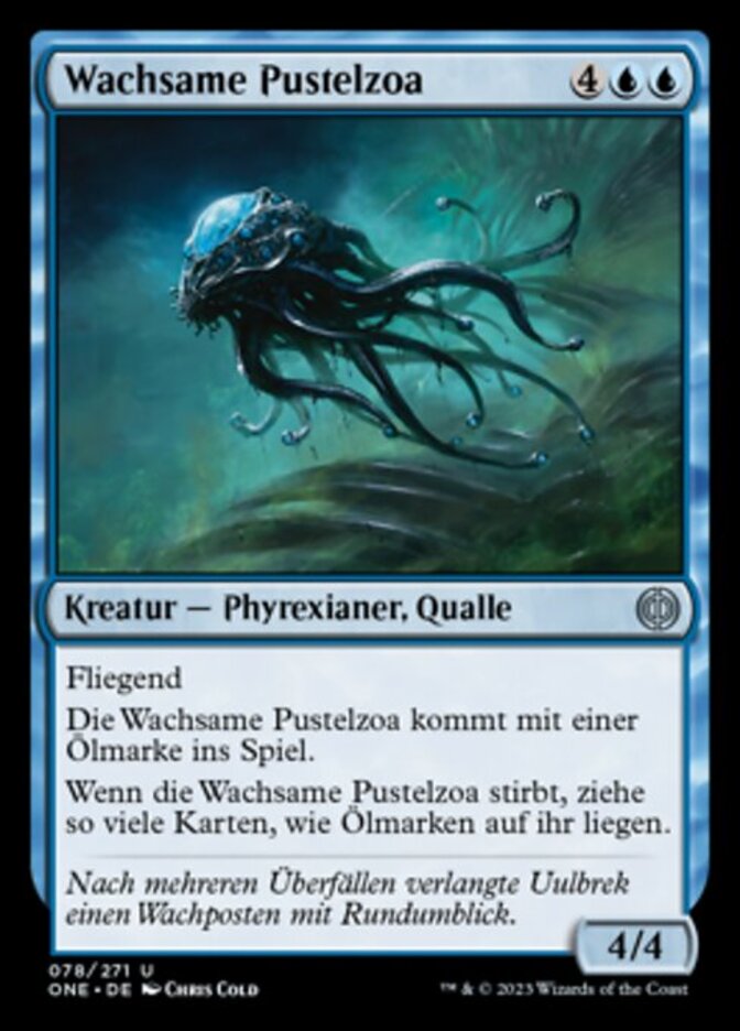 | Rules | Flying Watchful Blisterzoa enters the battlefield with an oil counter on it. When Watchful Blisterzoa dies, draw cards equal to the number of oil counters on it. |