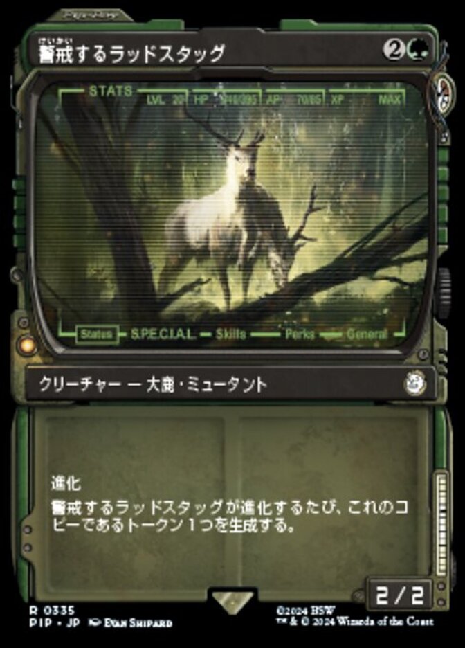 | Rules | Evolve (Whenever a creature enters the battlefield under your control, if that creature has greater power or toughness than this creature, put a +1/+1 counter on this creature.) Whenever Watchful Radstag evolves, create a token that's a copy of it. |