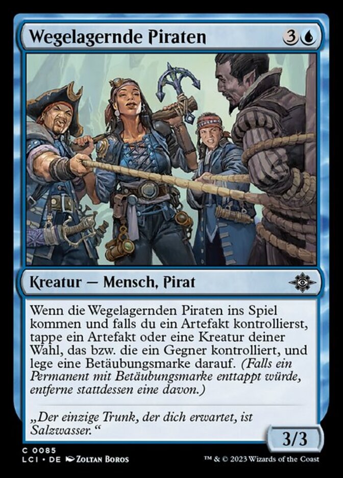 | Rules | When Waylaying Pirates enters the battlefield, if you control an artifact, tap target artifact or creature an opponent controls and put a stun counter on it. (If a permanent with a stun counter would become untapped, remove one from it instead.) |