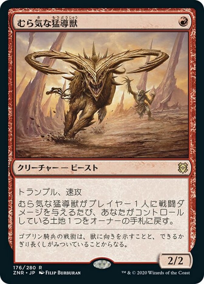 | Rules | Trample, haste Whenever Wayward Guide-Beast deals combat damage to a player, return a land you control to its owner's hand. |