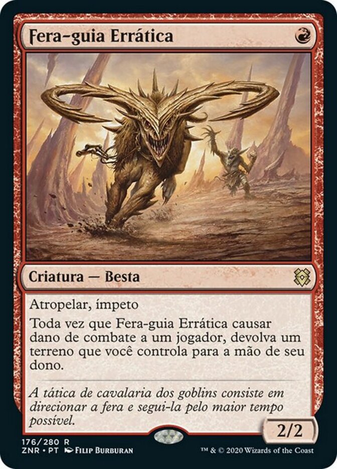 | Rules | Trample, haste Whenever Wayward Guide-Beast deals combat damage to a player, return a land you control to its owner's hand. |