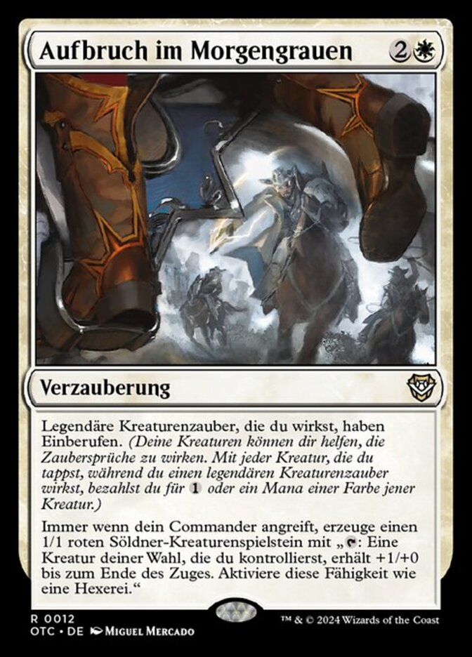 | Rules | Legendary creature spells you cast have convoke. (Your creatures can help cast those spells. Each creature you tap while casting a legendary creature spell pays for or one mana of that creature's color.) Whenever your commander attacks, create a 1/1 red Mercenary creature token with ": Target creature you control gets +1/+0 until end of turn. Activate only as a sorcery." |