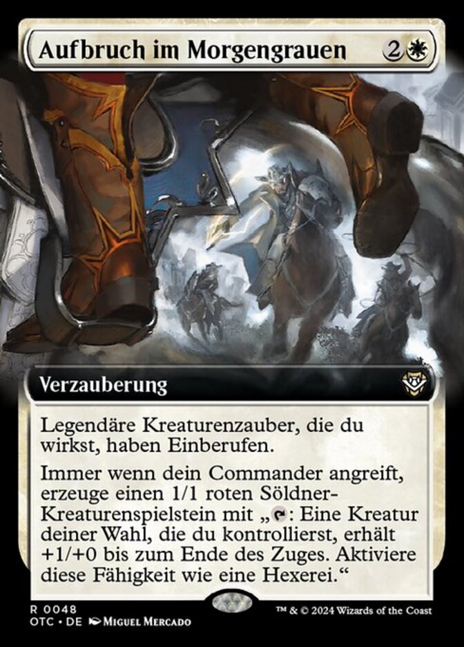 | Rules | Legendary creature spells you cast have convoke. (Your creatures can help cast those spells. Each creature you tap while casting a legendary creature spell pays for or one mana of that creature's color.) Whenever your commander attacks, create a 1/1 red Mercenary creature token with ": Target creature you control gets +1/+0 until end of turn. Activate only as a sorcery." |