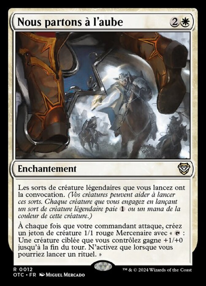 | Rules | Legendary creature spells you cast have convoke. (Your creatures can help cast those spells. Each creature you tap while casting a legendary creature spell pays for or one mana of that creature's color.) Whenever your commander attacks, create a 1/1 red Mercenary creature token with ": Target creature you control gets +1/+0 until end of turn. Activate only as a sorcery." |