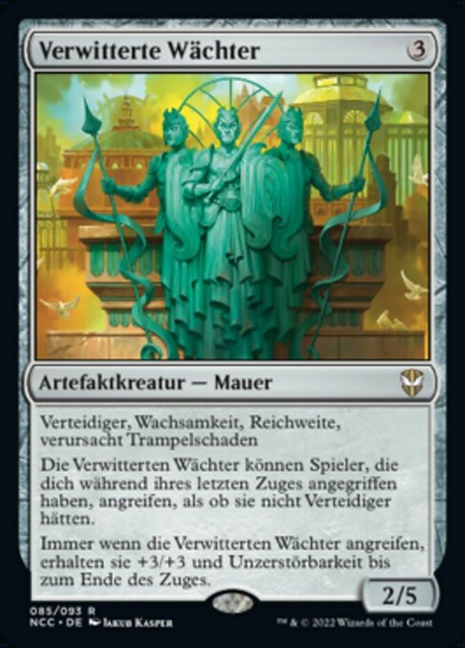 | Rules | Defender, vigilance, reach, trample Weathered Sentinels can attack players who attacked you during their last turn as though it didn't have defender. Whenever Weathered Sentinels attacks, it gets +3/+3 and gains indestructible until end of turn. |