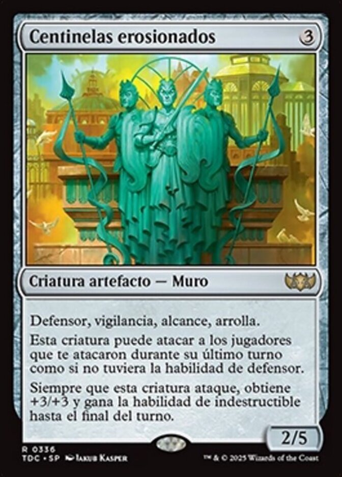 | Rules | Defender, vigilance, reach, trample Weathered Sentinels can attack players who attacked you during their last turn as though it didn't have defender. Whenever Weathered Sentinels attacks, it gets +3/+3 and gains indestructible until end of turn. |