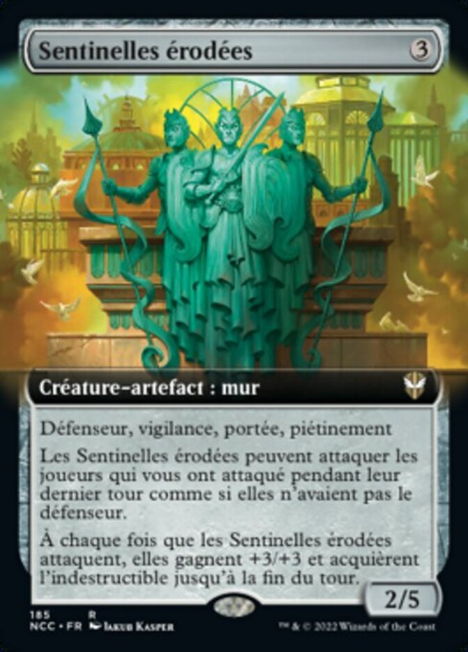 Whenever Weathered Sentinels attacks, it gets +3/+3 and gains indestructible until end of turn.