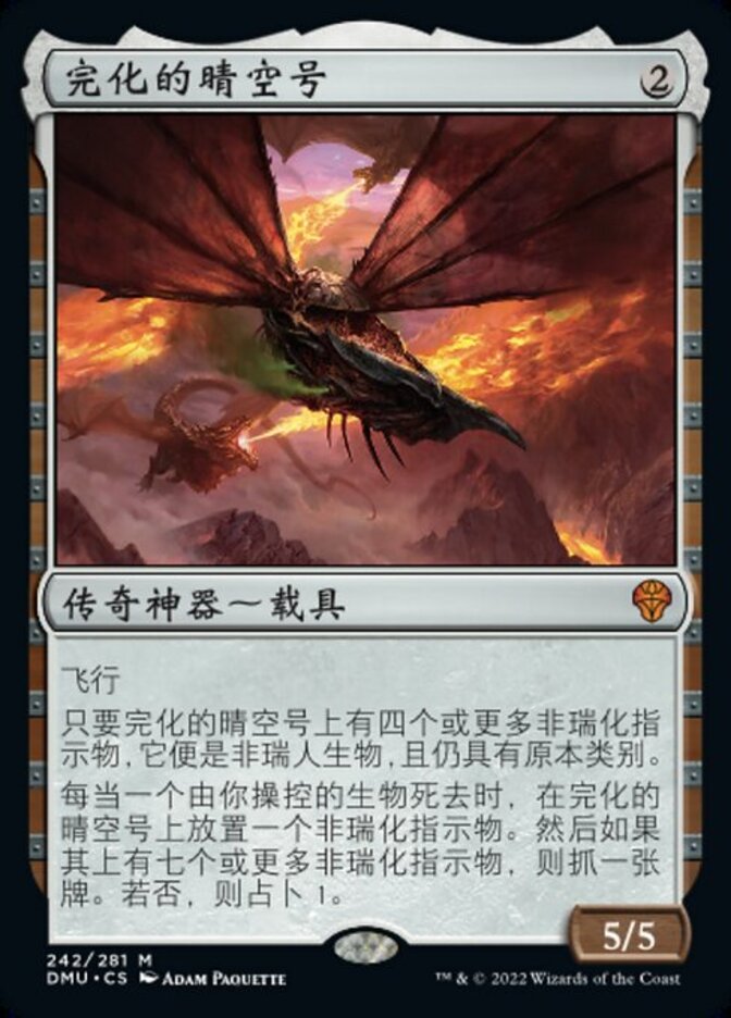 | Rules | Flying As long as Weatherlight Compleated has four or more phyresis counters on it, it's a Phyrexian creature in addition to its other types. Whenever a creature you control dies, put a phyresis counter on Weatherlight Compleated. Then draw a card if it has seven or more phyresis counters on it. If it doesn't, scry 1. |