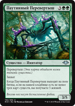 | Rules | Changeling (This card is every creature type.) Reach When Webweaver Changeling enters the battlefield, if there are three or more creature cards in your graveyard, you gain 5 life. |