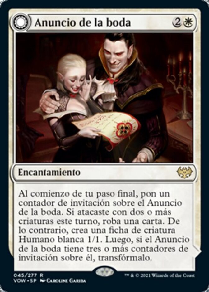 | Rules | At the beginning of your end step, put an invitation counter on Wedding Announcement. If you attacked with two or more creatures this turn, draw a card. Otherwise, create a 1/1 white Human creature token. Then if Wedding Announcement has three or more invitation counters on it, transform it. // Creatures you control get +1/+1. |