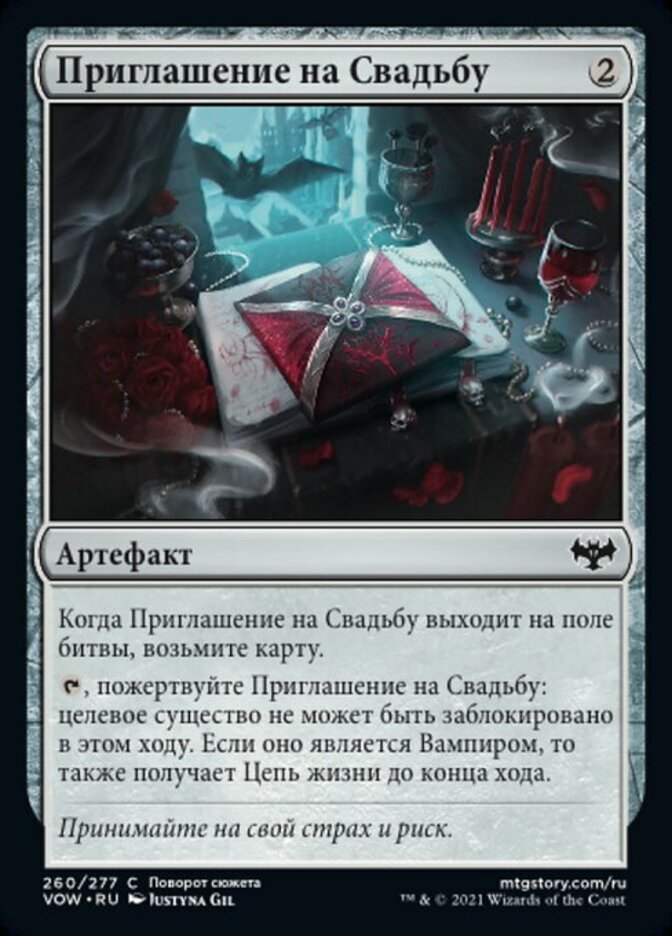| Rules | When Wedding Invitation enters the battlefield, draw a card. , Sacrifice Wedding Invitation: Target creature can't be blocked this turn. If it's a Vampire, it also gains lifelink until end of turn. |