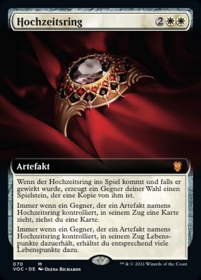 | Rules | When Wedding Ring enters the battlefield, if it was cast, target opponent creates a token that's a copy of it. Whenever an opponent who controls an artifact named Wedding Ring draws a card during their turn, you draw a card. Whenever an opponent who controls an artifact named Wedding Ring gains life during their turn, you gain that much life. |