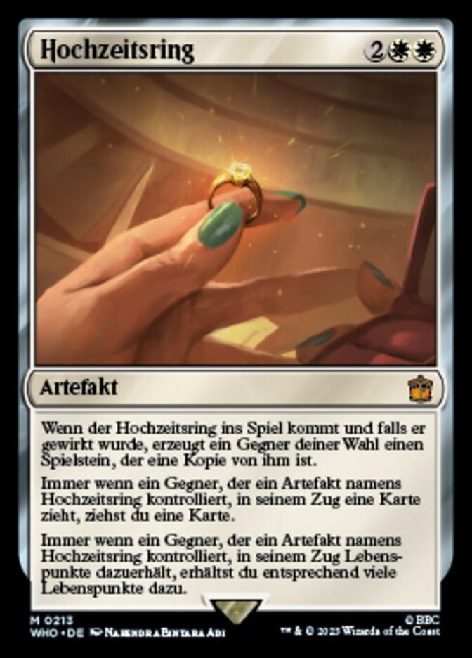 | Rules | When Wedding Ring enters the battlefield, if it was cast, target opponent creates a token that's a copy of it. Whenever an opponent who controls an artifact named Wedding Ring draws a card during their turn, you draw a card. Whenever an opponent who controls an artifact named Wedding Ring gains life during their turn, you gain that much life. |