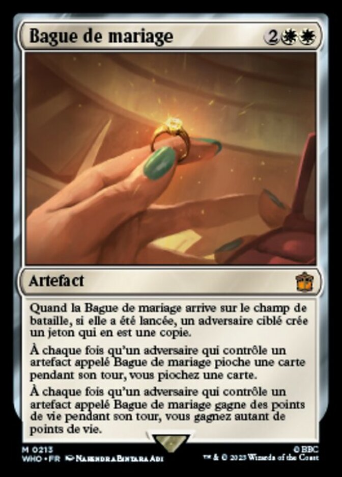 | Rules | When Wedding Ring enters the battlefield, if it was cast, target opponent creates a token that's a copy of it. Whenever an opponent who controls an artifact named Wedding Ring draws a card during their turn, you draw a card. Whenever an opponent who controls an artifact named Wedding Ring gains life during their turn, you gain that much life. |