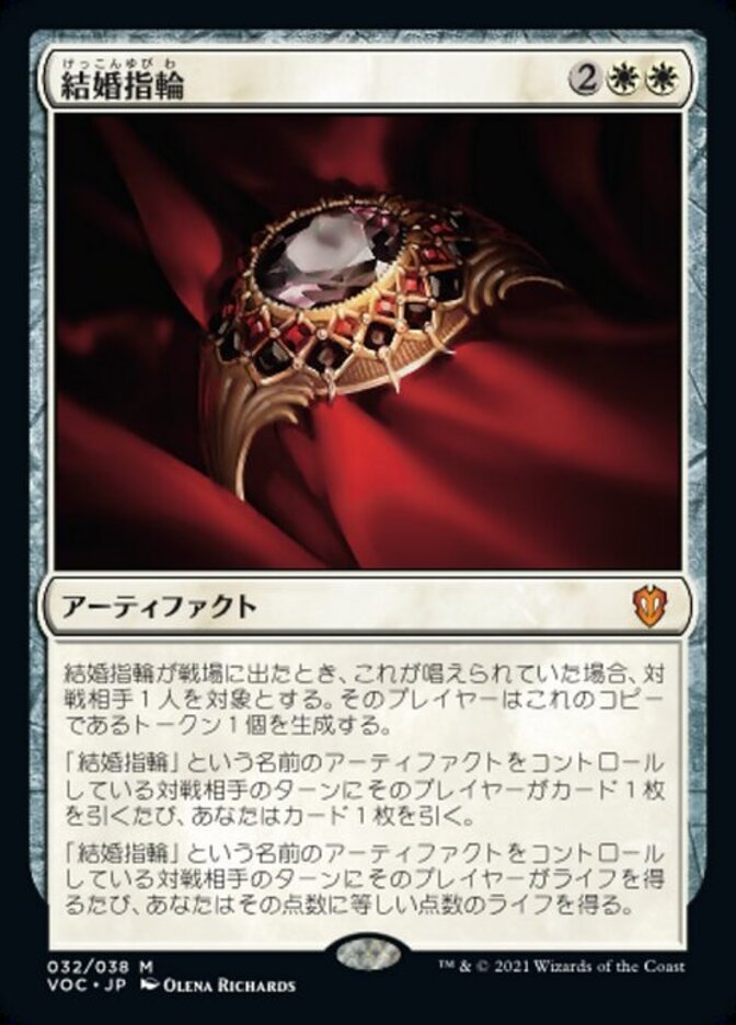 | Rules | When Wedding Ring enters the battlefield, if it was cast, target opponent creates a token that's a copy of it. Whenever an opponent who controls an artifact named Wedding Ring draws a card during their turn, you draw a card. Whenever an opponent who controls an artifact named Wedding Ring gains life during their turn, you gain that much life. |