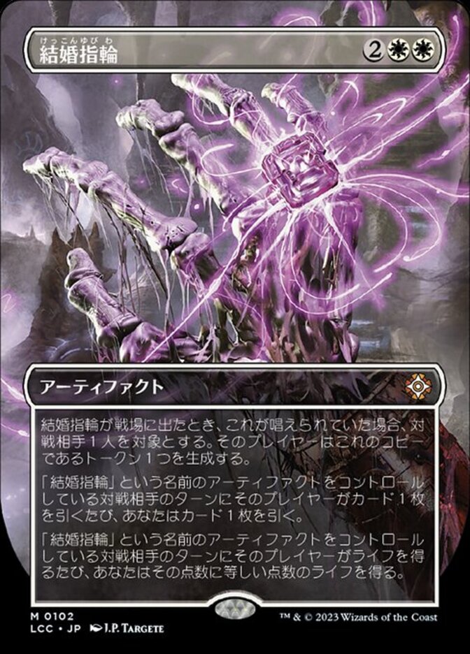 | Rules | When Wedding Ring enters the battlefield, if it was cast, target opponent creates a token that's a copy of it. Whenever an opponent who controls an artifact named Wedding Ring draws a card during their turn, you draw a card. Whenever an opponent who controls an artifact named Wedding Ring gains life during their turn, you gain that much life. |