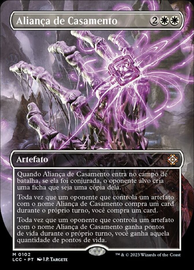 | Rules | When Wedding Ring enters the battlefield, if it was cast, target opponent creates a token that's a copy of it. Whenever an opponent who controls an artifact named Wedding Ring draws a card during their turn, you draw a card. Whenever an opponent who controls an artifact named Wedding Ring gains life during their turn, you gain that much life. |