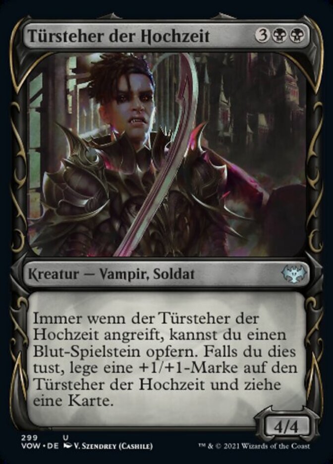 | Rules | Whenever Wedding Security attacks, you may sacrifice a Blood token. If you do, put a +1/+1 counter on Wedding Security and draw a card. |