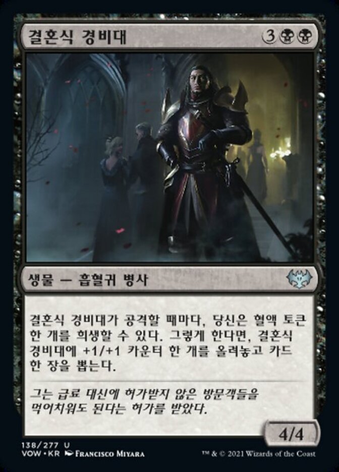 | Rules | Whenever Wedding Security attacks, you may sacrifice a Blood token. If you do, put a +1/+1 counter on Wedding Security and draw a card. |
