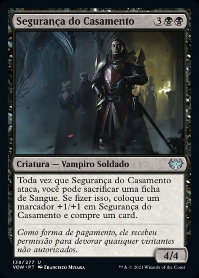 | Rules | Whenever Wedding Security attacks, you may sacrifice a Blood token. If you do, put a +1/+1 counter on Wedding Security and draw a card. |