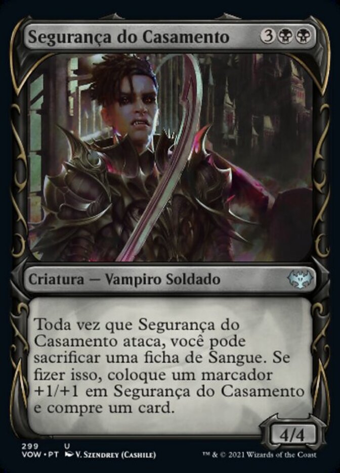 | Rules | Whenever Wedding Security attacks, you may sacrifice a Blood token. If you do, put a +1/+1 counter on Wedding Security and draw a card. |