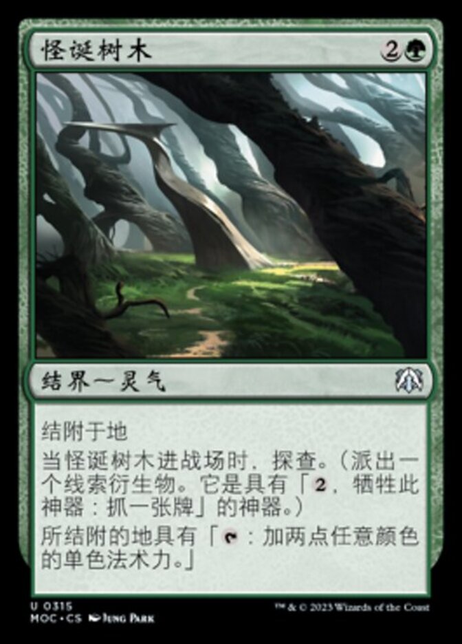 | Rules | Enchant land When Weirding Wood enters the battlefield, investigate. (Create a colorless Clue artifact token with ", Sacrifice this artifact: Draw a card.") Enchanted land has ": Add two mana of any one color." |