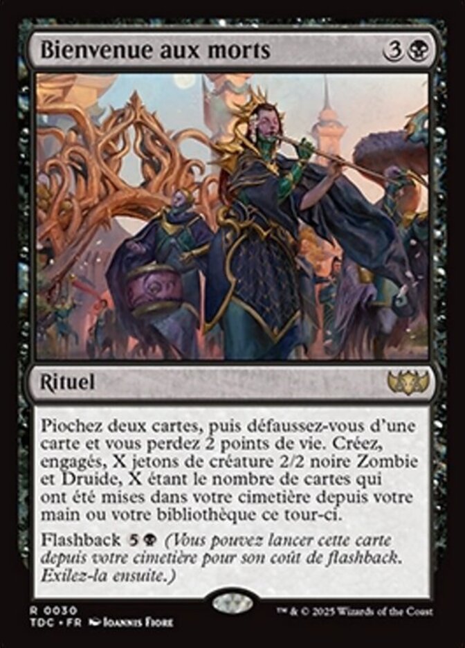 | Rules | Draw two cards, then discard a card and you lose 2 life. Create X tapped 2/2 black Zombie Druid creature tokens, where X is the number of cards that were put into your graveyard from your hand or library this turn. Flashback (You may cast this card from your graveyard for its flashback cost. Then exile it.) |