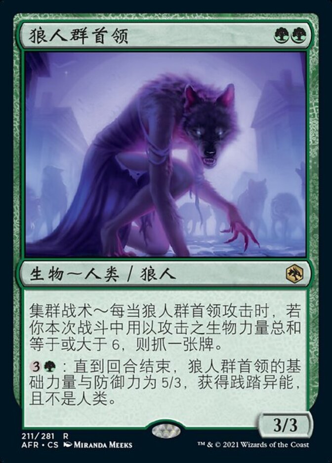 | Rules | Pack tactics — Whenever Werewolf Pack Leader attacks, if you attacked with creatures with total power 6 or greater this combat, draw a card. : Until end of turn, Werewolf Pack Leader has base power and toughness 5/3, gains trample, and isn't a Human. |