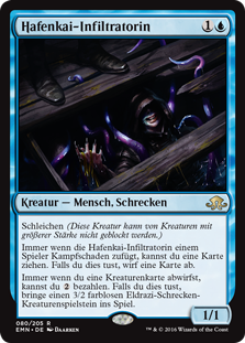 | Rules | Skulk (This creature can't be blocked by creatures with greater power.) Whenever Wharf Infiltrator deals combat damage to a player, you may draw a card. If you do, discard a card. Whenever you discard a creature card, you may pay . If you do, create a 3/2 colorless Eldrazi Horror creature token. |