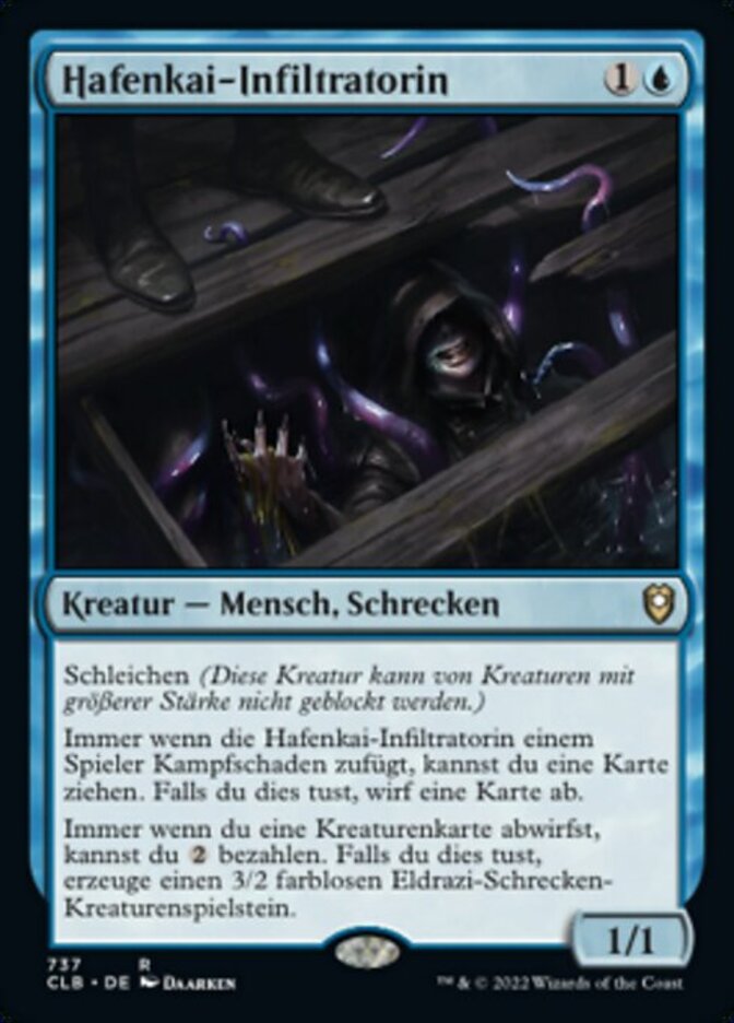 | Rules | Skulk (This creature can't be blocked by creatures with greater power.) Whenever Wharf Infiltrator deals combat damage to a player, you may draw a card. If you do, discard a card. Whenever you discard a creature card, you may pay . If you do, create a 3/2 colorless Eldrazi Horror creature token. |