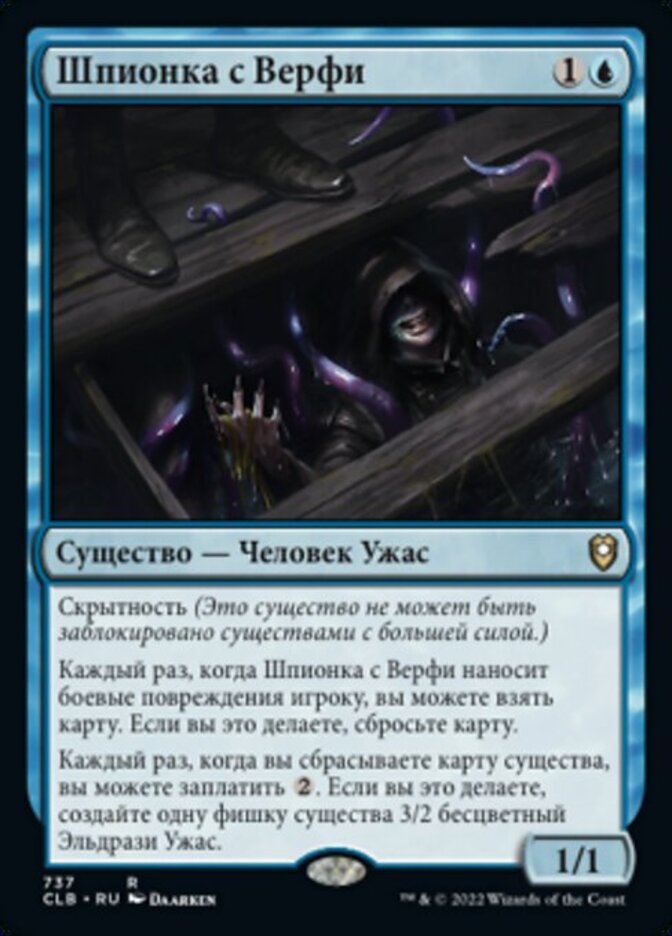 | Rules | Skulk (This creature can't be blocked by creatures with greater power.) Whenever Wharf Infiltrator deals combat damage to a player, you may draw a card. If you do, discard a card. Whenever you discard a creature card, you may pay . If you do, create a 3/2 colorless Eldrazi Horror creature token. |