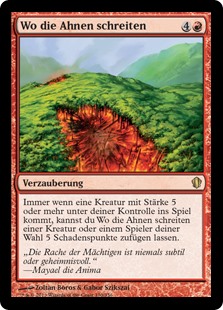 | Rules | Whenever a creature with power 5 or greater enters the battlefield under your control, you may have Where Ancients Tread deal 5 damage to any target. |