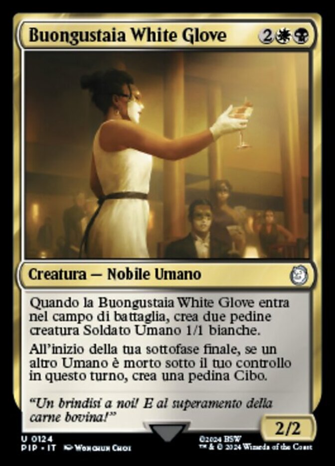 | Rules | When White Glove Gourmand enters the battlefield, create two 1/1 white Human Soldier creature tokens. At the beginning of your end step, if another Human died under your control this turn, create a Food token. |