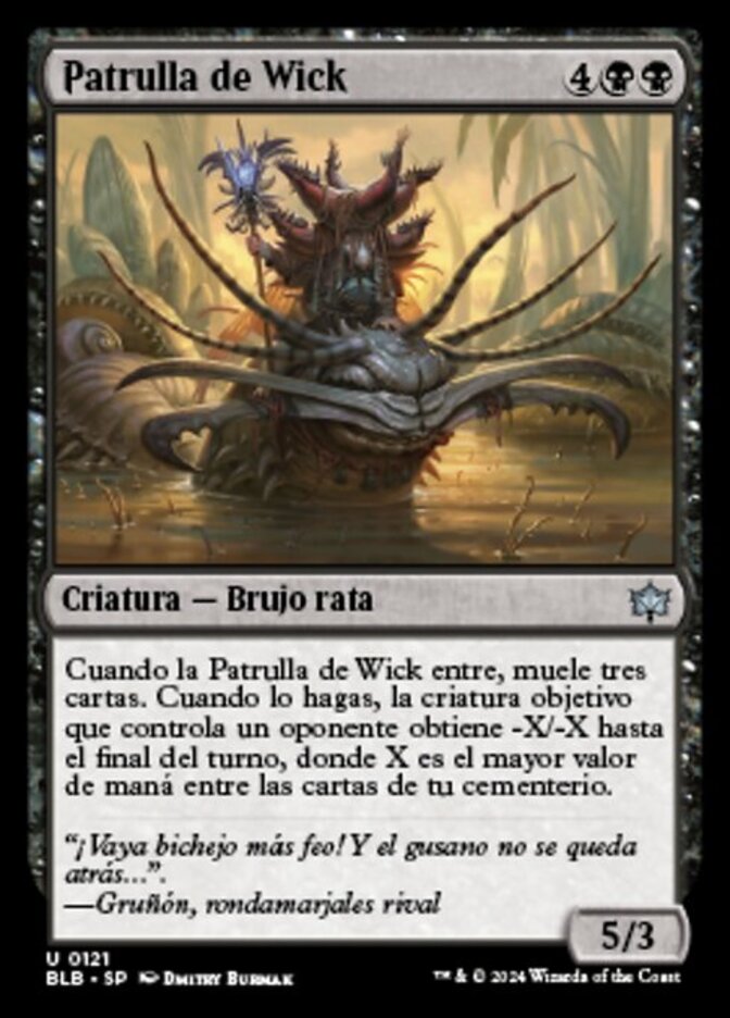 | Rules | When Wick's Patrol enters, mill three cards. When you do, target creature an opponent controls gets -X/-X until end of turn, where X is the greatest mana value among cards in your graveyard. |