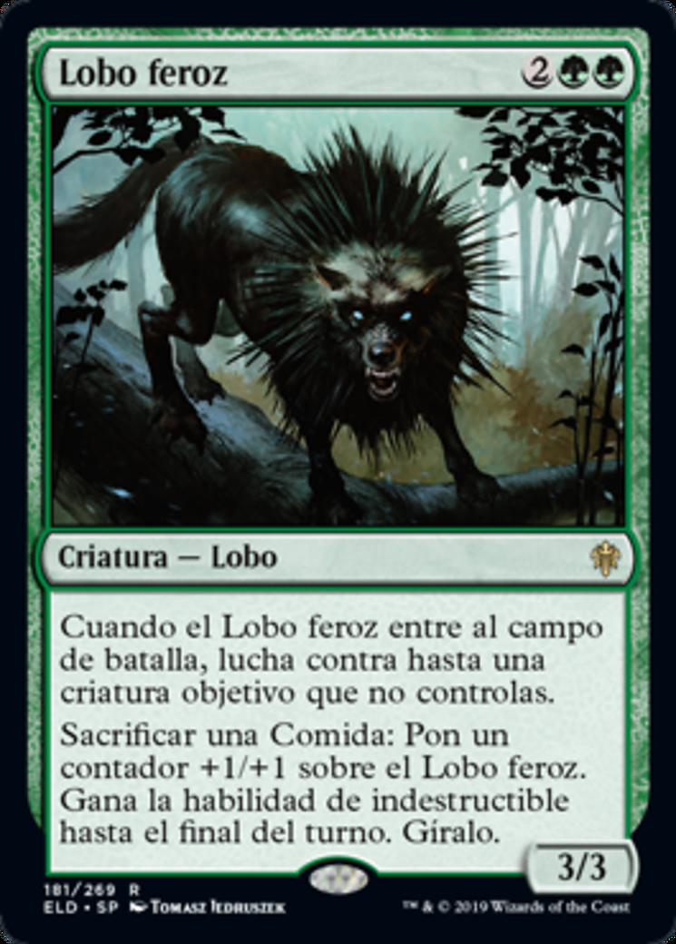 | Rules | When Wicked Wolf enters the battlefield, it fights up to one target creature you don't control. Sacrifice a Food: Put a +1/+1 counter on Wicked Wolf. It gains indestructible until end of turn. Tap it. |