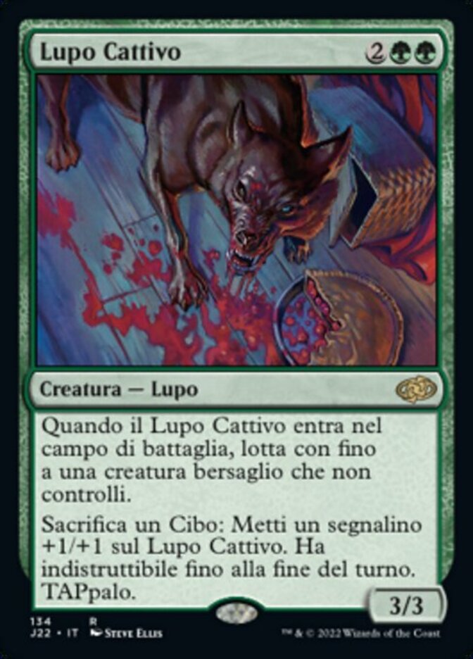 | Rules | When Wicked Wolf enters the battlefield, it fights up to one target creature you don't control. Sacrifice a Food: Put a +1/+1 counter on Wicked Wolf. It gains indestructible until end of turn. Tap it. |