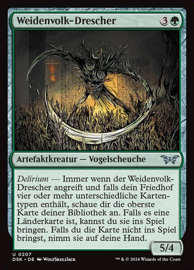 | Rules | Delirium — Whenever Wickerfolk Thresher attacks, if there are four or more card types among cards in your graveyard, look at the top card of your library. If it's a land card, you may put it onto the battlefield. If you don't put the card onto the battlefield, put it into your hand. |