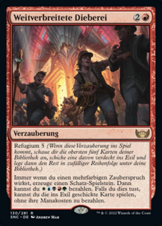 | Rules | Hideaway 5 (When this enchantment enters the battlefield, look at the top five cards of your library, exile one face down, then put the rest on the bottom in a random order.) Whenever you cast a multicolored spell, create a Treasure token. Then you may pay . If you do, you may play the exiled card without paying its mana cost. |