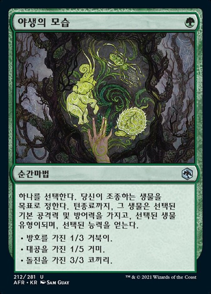 | Rules | Choose one. Until end of turn, target creature you control has that base power and toughness, becomes that creature type, and gains that ability. • 1/3 Turtle with hexproof. • 1/5 Spider with reach. • 3/3 Elephant with trample. |