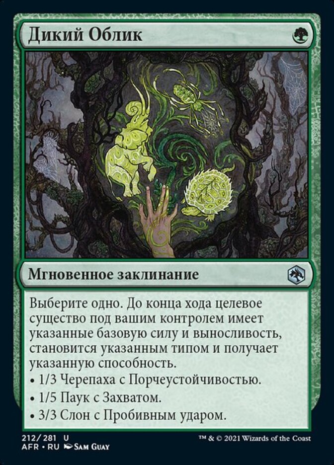 | Rules | Choose one. Until end of turn, target creature you control has that base power and toughness, becomes that creature type, and gains that ability. • 1/3 Turtle with hexproof. • 1/5 Spider with reach. • 3/3 Elephant with trample. |