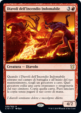 | Rules | When Wildfire Devils enters the battlefield and at the beginning of your upkeep, choose a player at random. That player exiles an instant or sorcery card from their graveyard. Copy that card. You may cast the copy without paying its mana cost. |