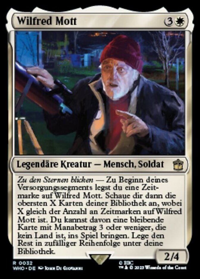 | Rules | Look to the Stars — At the beginning of your upkeep, put a time counter on Wilfred Mott. Then look at the top X cards of your library, where X is the number of time counters on Wilfred Mott. You may put a nonland permanent card with mana value 3 or less from among them onto the battlefield. Put the rest on the bottom of your library in a random order. |