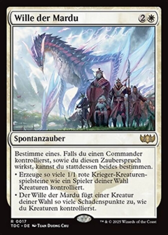 | Rules | Choose one. If you control a commander as you cast this spell, you may choose both instead. • Create a number of 1/1 red Warrior creature tokens equal to the number of creatures target player controls. • Will of the Mardu deals damage to target creature equal to the number of creatures you control. |